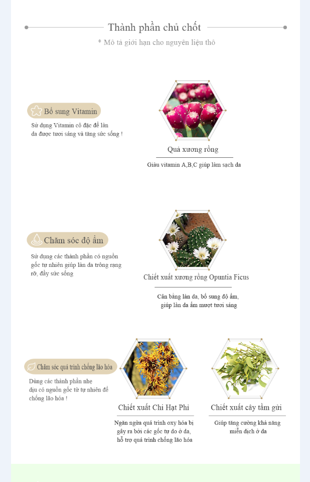 Thành phần Nước tinh khiết, glycerin, cellulose, butylene glycol, rượu biến tính, dipropylene glycol, pentylene glycol, ceteareth-12, chiết xuất lê gai, chiết xuất lá lô hội, chiết xuất hoa xương rồng, chiết xuất cây phỉ, chiết xuất cây tầm gửi, Caprylyl Glive Polysorbate 20, 1, 2 Sexan Daum, Allandine, Betaine, Dipotassium Glycyrusate, Trehalose, Aloe Vera Leaf Polysaccharide, Citric Acid, Propylene Glytic Acid, Salicylate Silic Acid, Ethylhexylglycerin, Sensqualane, Carbomer, Triethanolamine, Disodium EDTA, Young City