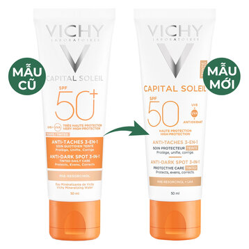 Kem Chống Nắng Vichy Capital Soleil Anti-Dark Spot 3-in-1 Tinted Daily Care SPF 50 UVA + UVB với công nghệ tiên tiến không những giúp bảo vệ da bạn trước tác động bởi ánh mặt trời gây lão hoá, xỉn màu mà còn tạo lớp trang điểm nhẹ nhàng giúp che phủ một số khuyết điểm trên gương mặt.