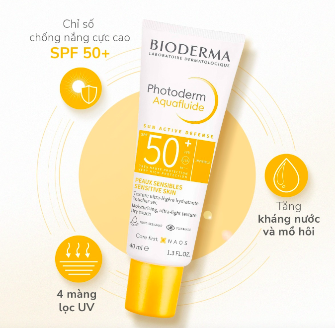 Photoderm Aquafluide giúp bảo vệ da tối ưu khỏi tác hại của tia UV (cháy nắng, dị ứng ánh nắng mặt trời, v.v.) nhờ bộ lọc tia UVA/UVB kết hợp với khả năng bảo vệ sinh học từ bên trong độc đáo có trong bằng sáng chế Cellular Bioprotection™. Bằng sáng chế này giúp kích hoạt chức năng phòng thủ tự nhiên, bảo vệ tế bào và ngăn ngừa lão hóa da sớm. Kết hợp thêm 3 loại phấn kiềm dầu giúp da khô thoáng và mịn màng.