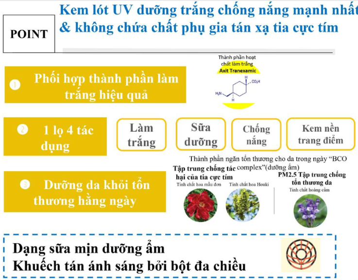 - Là 1 sản phẩm chứa 4 công dụng: làm trắng, sữa dưỡng, chống nắng và kem nền trang điểm.