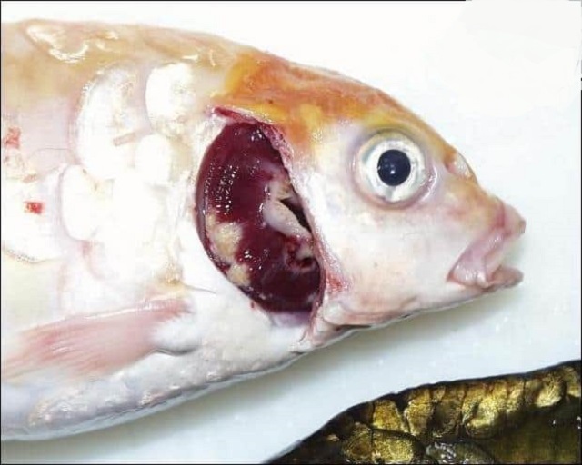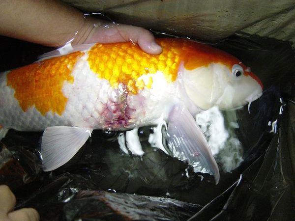 Vết thương làm cá dễ nhiễm khuẩn nặng đẫn tới koi bi thêm bệnh đốm trắng, đốm đỏ, lở loét rồi chết chết hàng loạt.